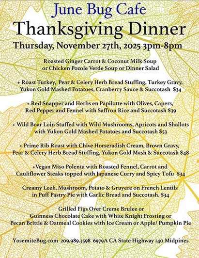 The June Bug Cafe at the Yosemite Bug Rustic Mountain Resort has become known for its yearly Thanksgiving dinner. Enjoy all the classics and skip the cooking and clean up after.