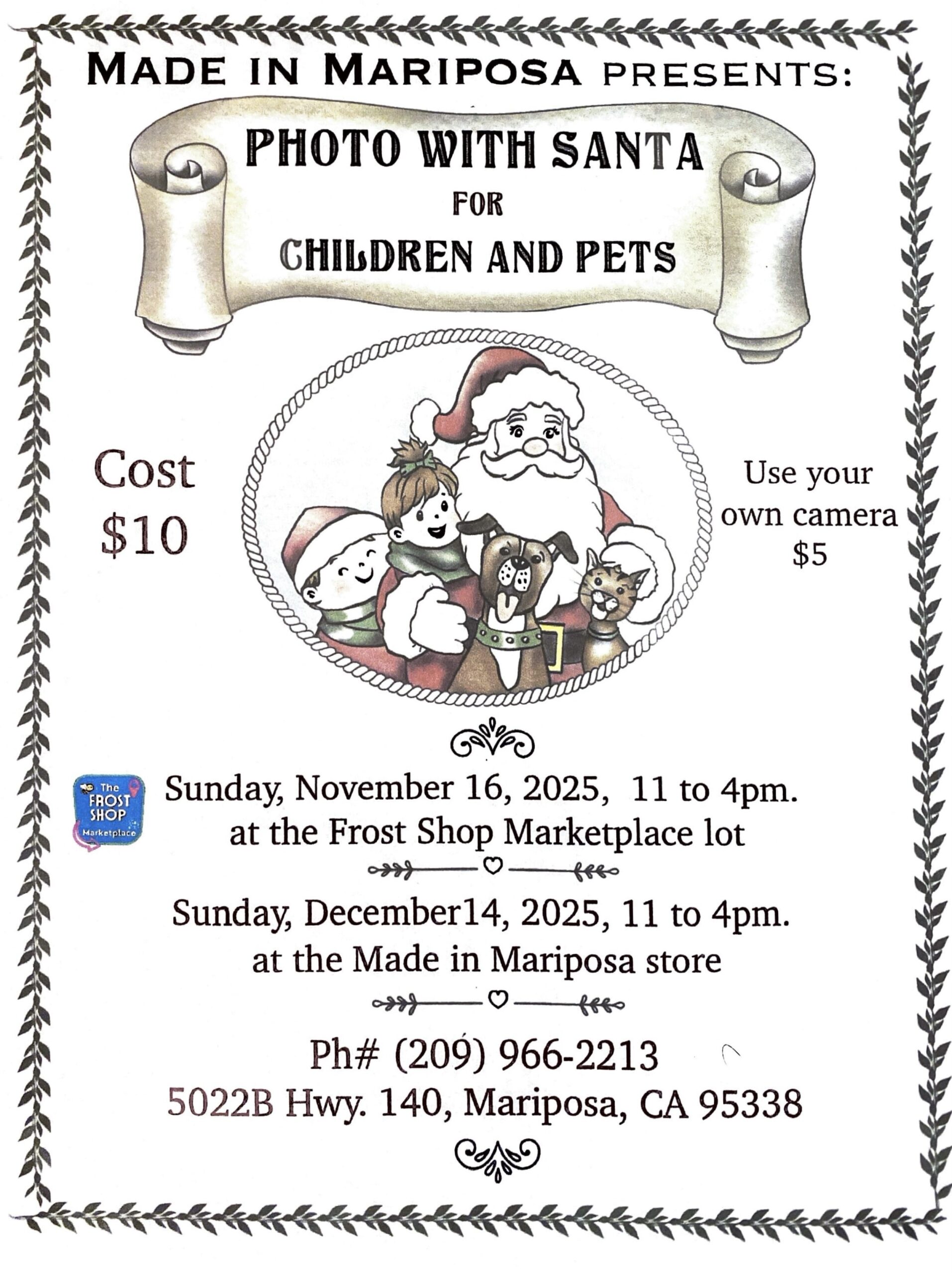 Cost: $10 per shoot (1 printed photo) or $5.00 with your own camera (Adult must accompany children and pets. Pets must be on leash.) Santa and his MiM helpers will be making a second Mariposa appearance at the MiM Store in downtown Mariposa. Bring your 2-legged or 4-legged family members. Schedule your appointment at the […]