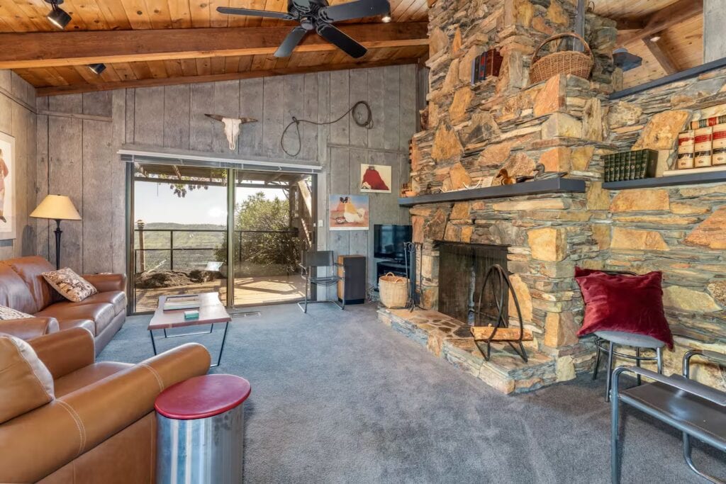 This gorgeous mountaintop hideaway with million-dollar views sits on 122 unique acres and is centrally located between the Arch Rock entrance and the southern entrance to Yosemite National Park. The Hideaway, a 2-plus bedroom, 2 baths, bi-level chalet, has high open beam ceilings and is centered around a massive fieldstone fireplace. Surrounding the chalet is an expansive multi-level deck with BBQ, pool and hot tub, where one can enjoy sensational sunsets and spectacular views. This unique property is especially suited to the couple looking for a romantic getaway and is perfect for those wanting to go to Yosemite during the day but desiring to get away from the crowds in the evening.
