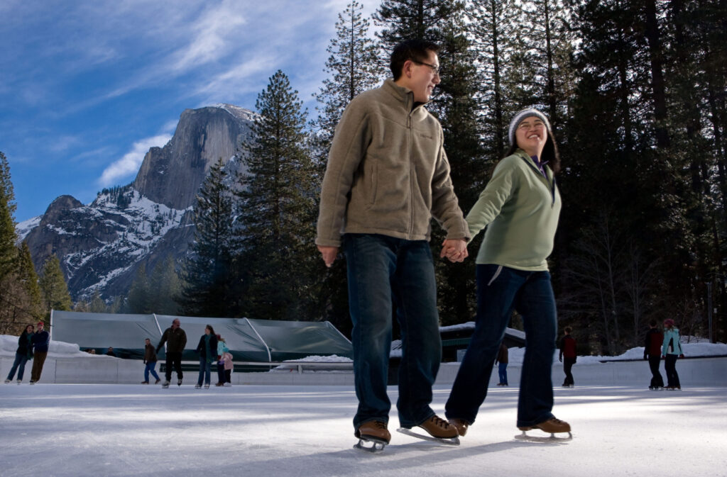 Ice skating mitten-in-mitten under the approving eye of Glacier Point is a lovers’ dream on Valentine’s Day, or any winter day in Yosemite Valley. Warm up with an Irish Coffee around one of the fire pits and imagine the epic pageantry of the historic Yosemite Firefall at this Curry Village hot spot.
